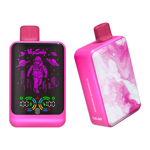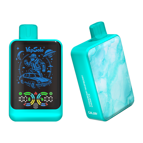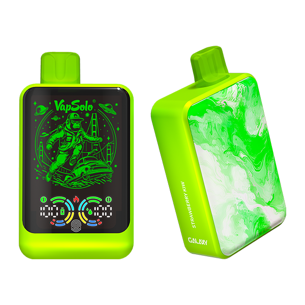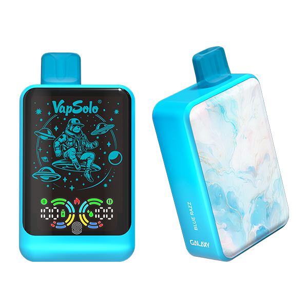 The Galaxy e-cigarette features a rectangular design with modern matte elements. It has a large front display and